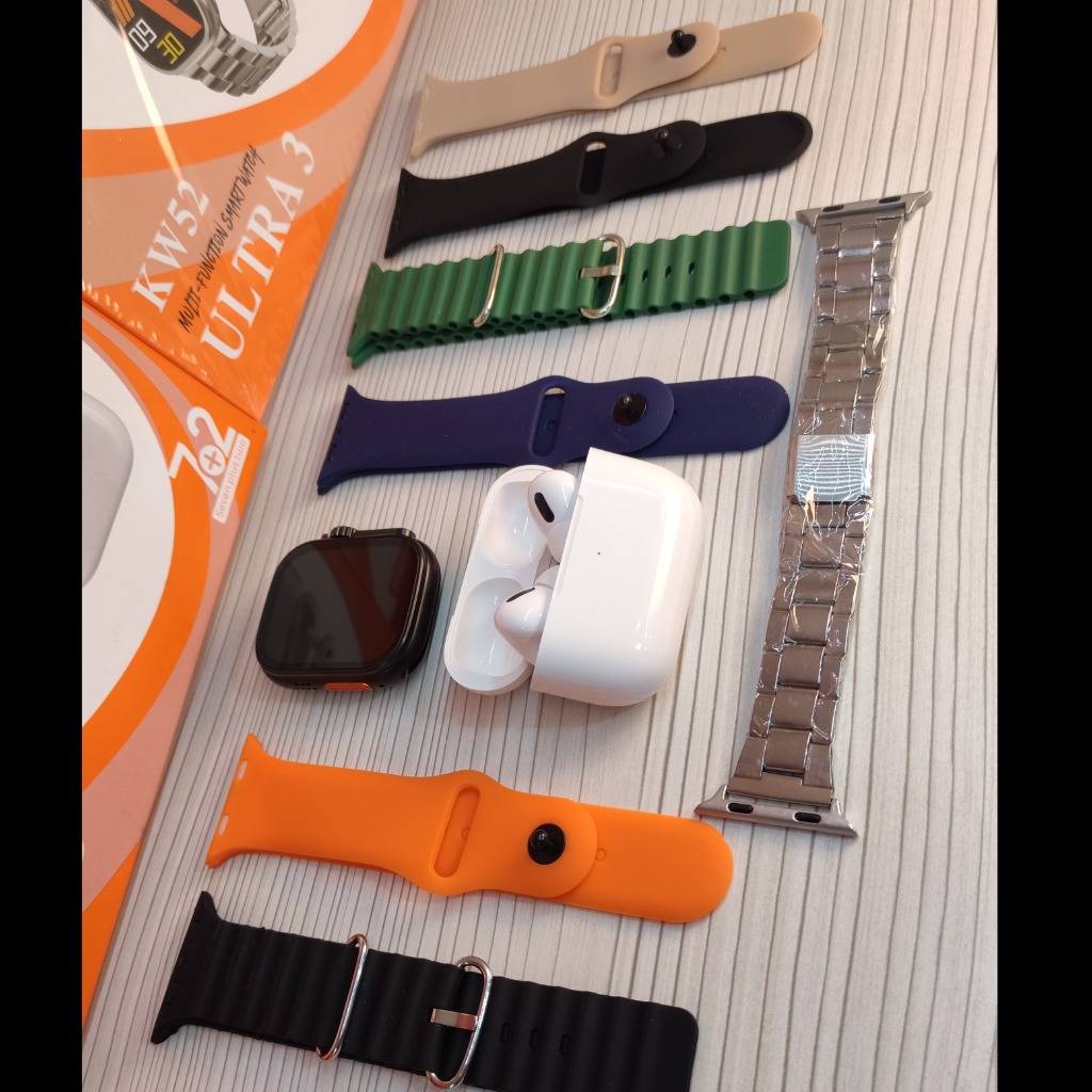 پک کامل اپل واچ اولترا مدل KW52 به همراه ایرپاد پرو2 اپل و 7 عدد بند اضافه متنوع با یک عدد بند رولکسی تمام استیل و دو عدد شارژر وایرلس ✔️