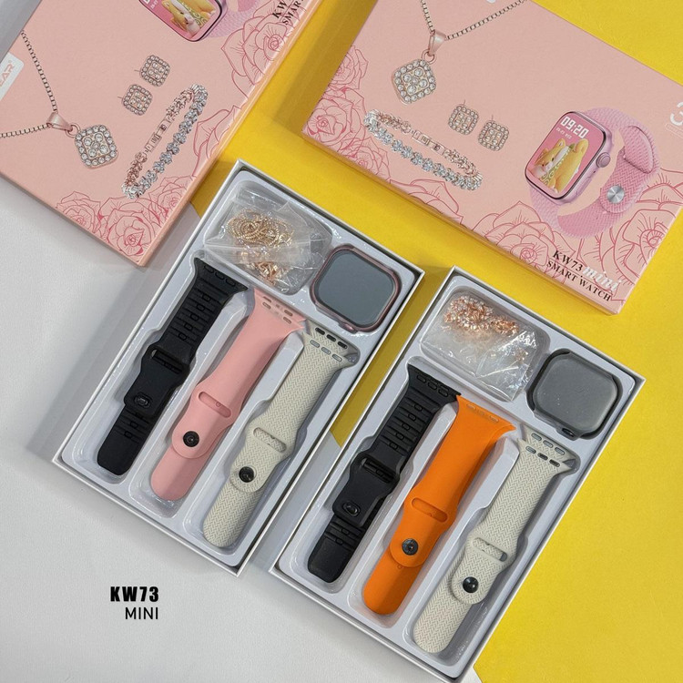 ساعت هوشمند دخترانه مدل KW73 با گوشواره دستبند گردنبند اورجینال و 3 بند اضافه